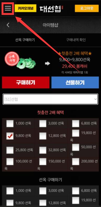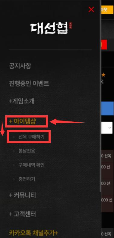 선옥은 홈페이지에서 좌측상단 메뉴를 선택하신 후 아이템샵 > 선옥 구매하기를 선택하시면 선옥 구매 페이지에서 서버를 선택하신 후 구매가 가능합니다.