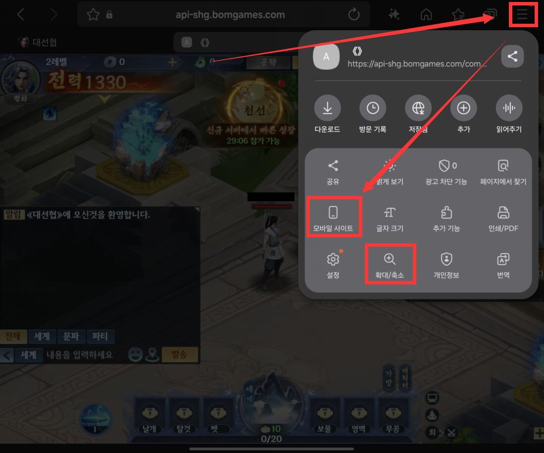 게임 입장 후 인터넷 설정을 선택하시면 데스크톱 사이트(혹은 모바일 사이트)버튼이 있습니다. 해당 버튼을 선택하시면 재로딩이 진행되며 PC 환경 페이지로 실행됩니다. PC환경 페이지에서는 정상적으로 구매를 진행하실 수 있습니다.